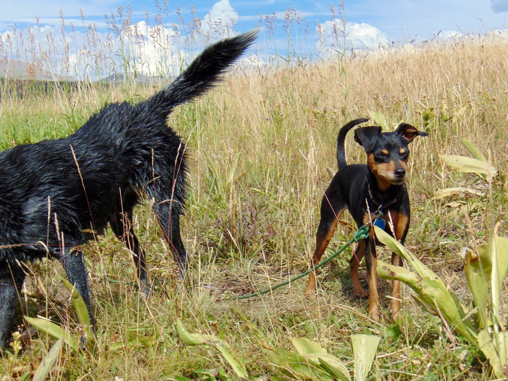 These are our faithful companions, Frankie and Lola. Frankie’s the impetuous prima donna min-pin, Lola the OCD blue roan perma-puppy. Also known as the dweezil and the heel-ote, Rat and Piglet, Pip and Squeak, Shorty and the Furball, Little-big-sister and Big-little-sister, and most often as Franks and Leeloo, these two poorly trained domestic beasts are the source of some frustration, offset with endless entertainment and unconditional love.