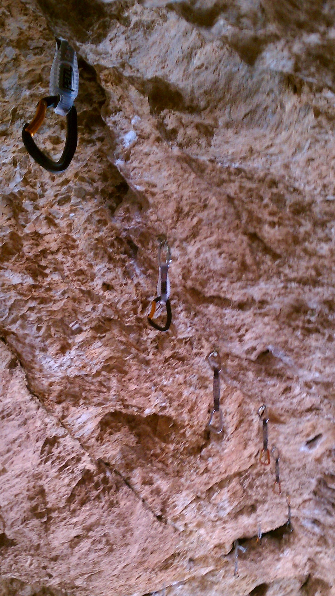 Technically, I started working this particular route at the end of a successful day back in December. I was exhausted, and basically aided my way only about 4 bolts out, but that was enough to stimulate an emotional response that lodged the route in my brain. But, it was a full number grade harder than the route I’d sent earlier that day, so I put it on the back burner. Our bouldering season began before I sent anything else. And then I injured my left ring finger, ergo…no crimping. When we came back to the cave at the beginning of March, I chose to work a steep line with jugs and slopers. Once that was done, the finger was still feeling a bit dodgy, so I went shopping for another option that wouldn’t stress it too badly. The crimpy route I’d left undone in December was out of the question, as was the one Charlie had been encouraging me to try. It’s a long extension of a climb I did prior to switching to bouldering mode, and my beta on the approach pitch uses a wicked left hand crimp. I got on an epic new route Todd Perkins put up, to find that the first crux is a series of seriously bad crimps. And all the while, I felt the little 50-foot roof at the back of the cave smirking at me, daring me to come back to it. I’d known it would.
