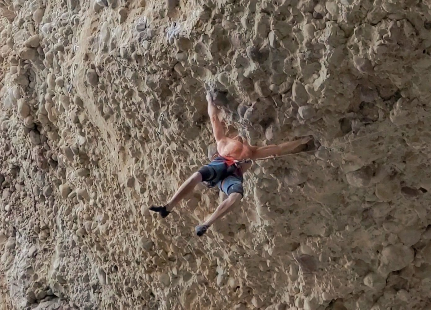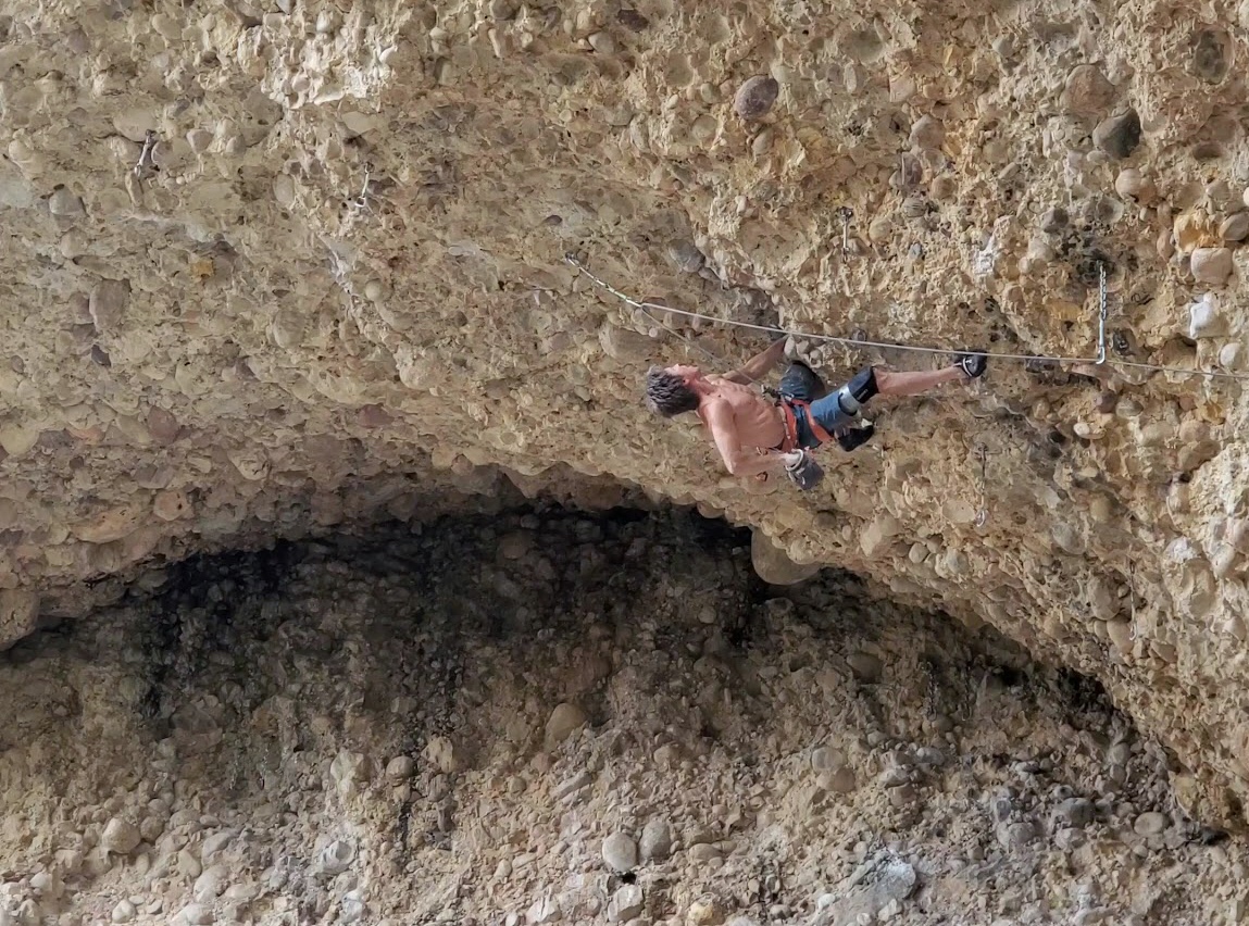 I began by quickly repeating routes I love. First La Confianza (7c+/13a). Then Rodeo Clown (8a/13b) which exits the Pipedream on the same horizontal roof as T-Rex. I repeated Millennium shortly after and had a high-point on T-Rex midway through the final roof by late May. Then, suddenly came summer and oppressive heat. Even worse, the record high temperatures were accompanied by extremely dry conditions. My skin is extremely parched due to my advanced age. I typically need the humidity to be above the 20% mark or I’ll dry fire off cobbles frequently, often without warning. Everything feels slippery to me with temps of 75f and 10-15% humidity. My skin suffers additional cuts and tearing to the point that I have super glue and tape on nearly every finger by now. I’ve become a perfect condition princess. Duchess requires that it be between 25-35% humidity and 60-65f. That’s a pretty narrow window. We might get three or four days a season that fit that bill. I need to be ready and can only hope they coincide with our Monday-Wednesday-Friday climbing schedule… sigh.
