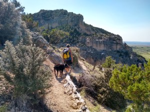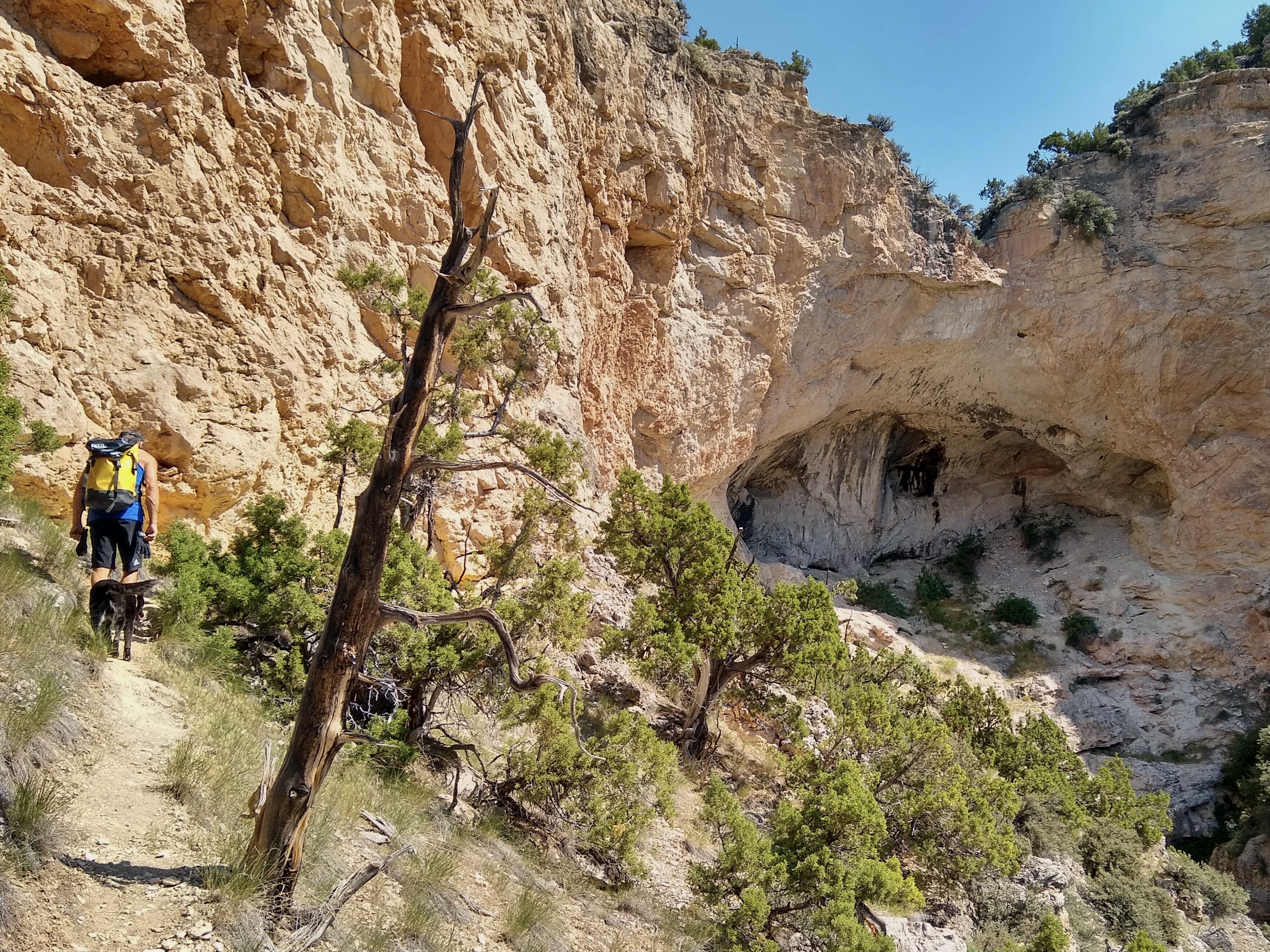 Consistently good conditions have not yet hit Ten Sleep. We didn’t see a soul at the cliff on Wednesday and Friday, our next two climbing days. After a weekend of rest for Charlie (I climbed in the gym at the Rock Ranch on Sunday because the Monday forecast indicated a belay-only day for me), we headed back up. Charlie, in front of our human-canine-human crew, walked a few feet past the turn-off, then stopped and retreated. His pretty little balanced cairn had been reduced to a haphazard pile. The same with the next two. In the cave, there were a myriad of new footprints, along with a used hand warmer, an ink pen, and discarded food wrappers. So much for Leave no Trace.