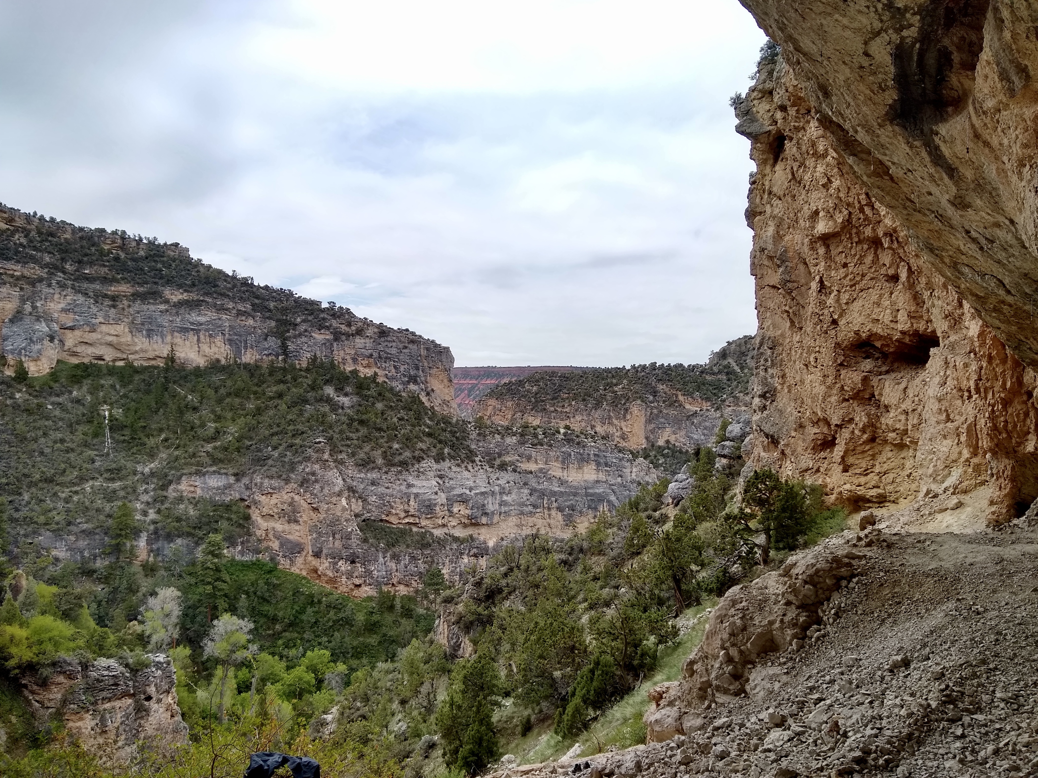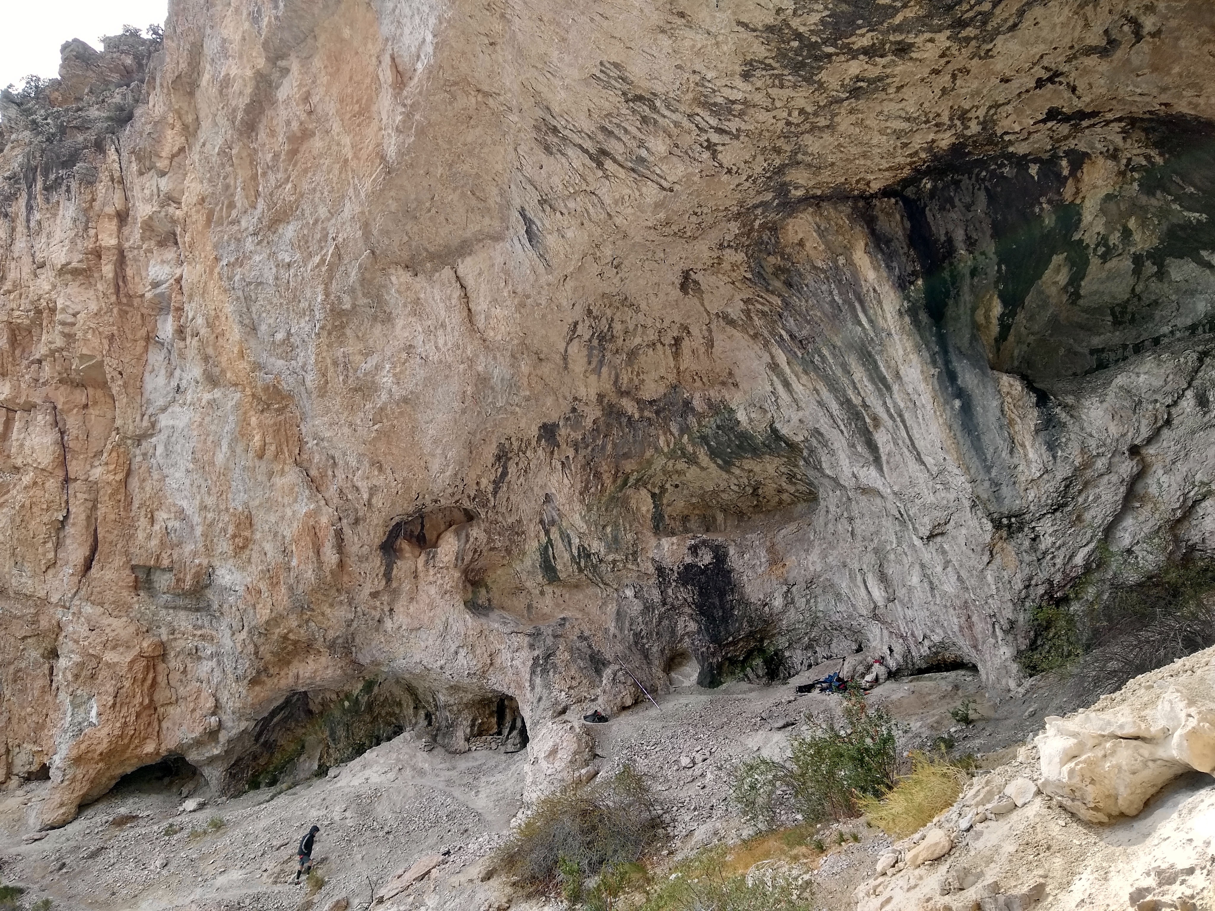 On the rainy Tuesday after we arrived, we geared up in Goretex and headed out to assess the condition of the trail, and make sure we could find it again easily, loaded down with gear, the next day. The junction from the main trail to begin switching back up into the draw the cave is situated in was never very obvious, and we expected for it to take a minute to find. We hiked quite a way until we agreed we’d gone too far and must have missed it, then backtracked to locate the still winter-bare mulberry bush that announces the start of the uphill portion of the approach. Not wanting to do that again, Charlie picked up a few rocks laying in the vicinity and stacked them in a neat cairn. To encourage consistency through the next section of trail, he did the same at two points about 30 feet apart further on.