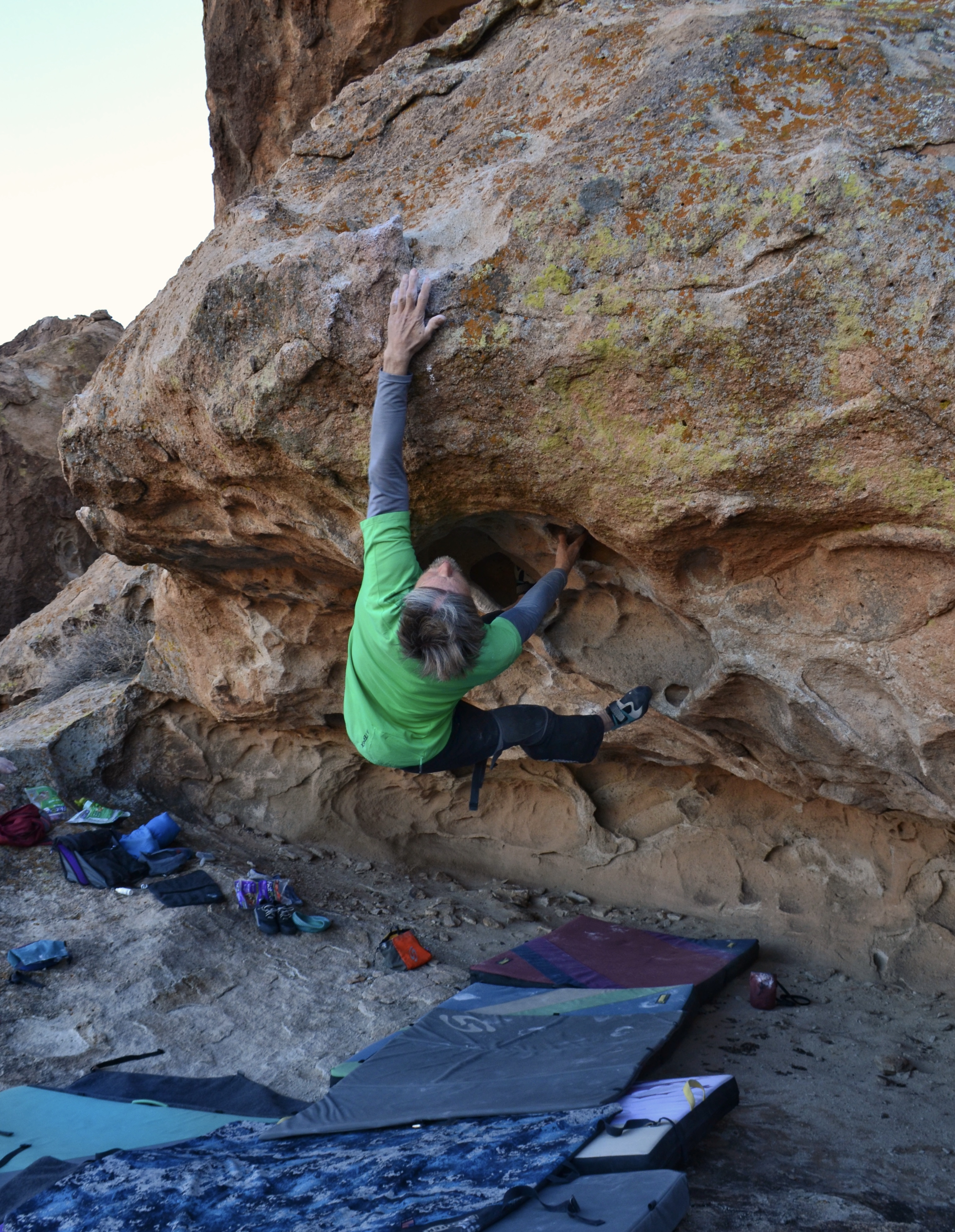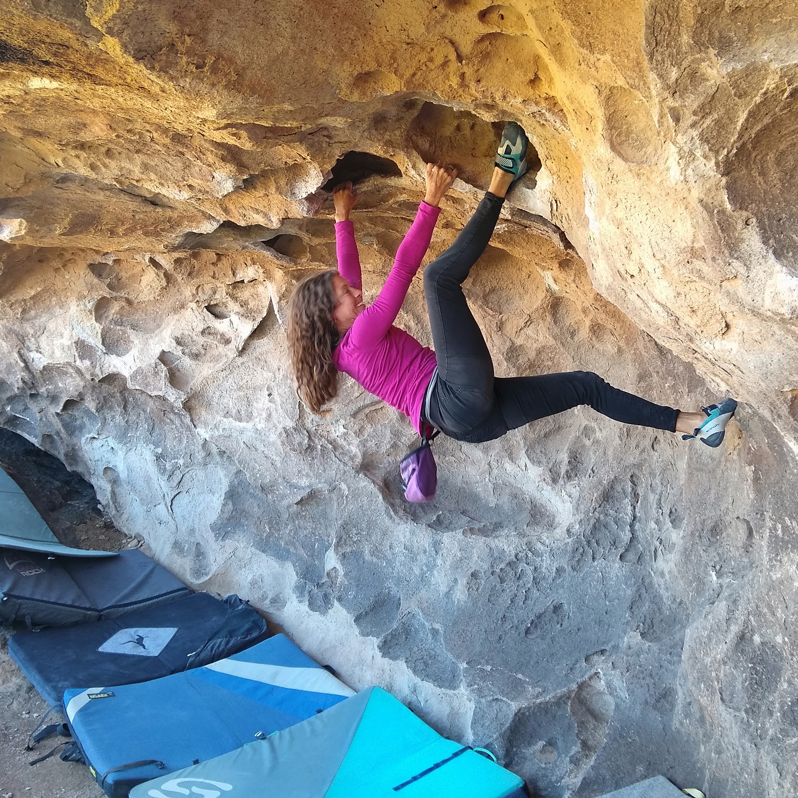 Bouldering is hard on our aging bodies and requires additional rest between training sessions. This gives us time to explore the copious rock art that lies protected within Hueco Tanks State Park. Pictographs abound. Pottery shards, arrowheads and tool chippings appear magically after a rain. We leave them all untouched and take only pictures and fond memories.