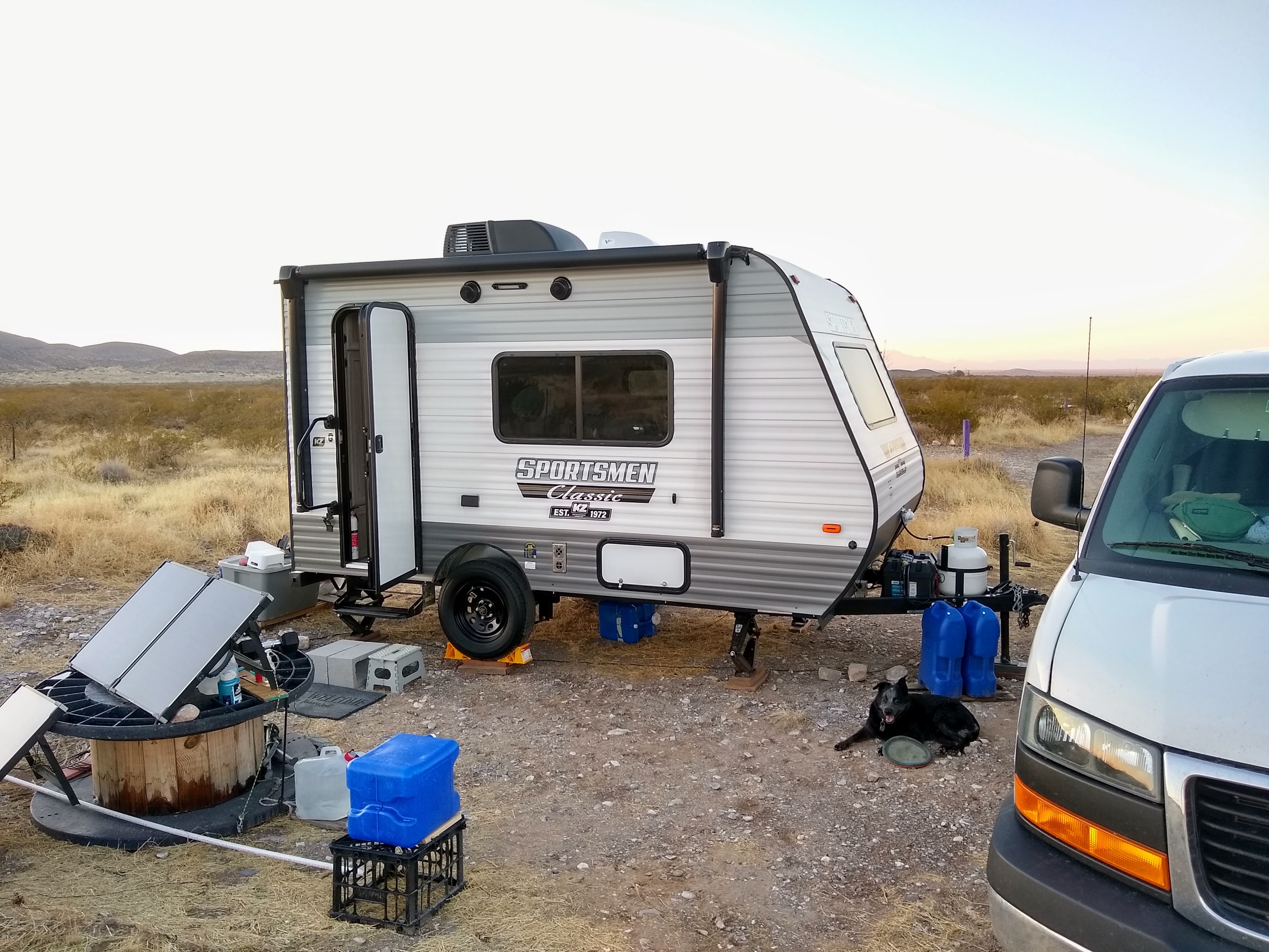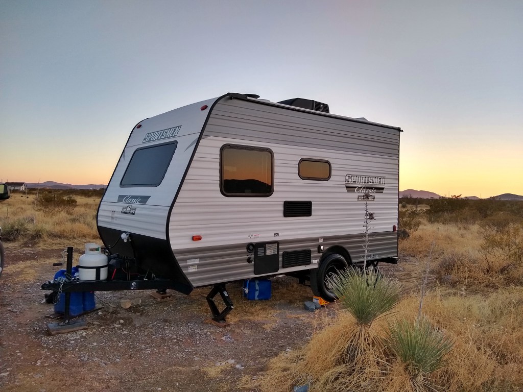 As a side note, in the latter half of November we made a 3400-mile round trip to Pennsylvania to pick up a new trailer, increasing our living space by 21 square feet. When Alexander SuperScamp was totaled in an accident on the Silver City Highway in New Mexico as we left Hueco on our way to Bishop three years ago, we replaced him with a new 2019 13-ft Scamp. After more than seven years of living in fiberglass “eggs,” we now have a “regular” camper with a bathroom, a kitchen counter, and a bed that’s 10″ wider than the old one (meaning fewer elbows to the face for me- yay!). I’m calling it The Mansion.