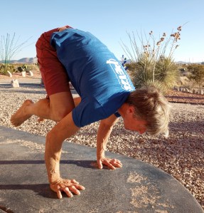 During the beatdown process, bouldering sessions consist of three days a week of hard pulling on steep stone. Sounds fun, right? Sure, but, that’s not the full picture. My body has been around for 67 years and I’ve been hammering it hard for… hmmm… 66? Most of my bouldering sessions are followed by additional training on the tower-of-power tripod back in camp. Pull ups, chin ups, abdominal abuse, ring push-ups and/or dumbbell workouts. Off days include Ashtanga yoga and additional core training. Sometimes I rest, usually when the pain level exceeds seven-ish.