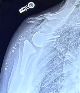 The procedure was a full reverse right (dominant) shoulder replacement. A large portion of the humeral head was removed and replaced with a cup-shaped receptacle mounted on a long titanium stem which was literally pounded into the humerus. On the opposite side of my shoulder a titanium ball mounted on a plate was solidly fastened to the glenoid by four long titanium screws. Essentially, I’ve been screwed, glued and tattooed. The whole shebang happened on May 14th and took just over two hours.